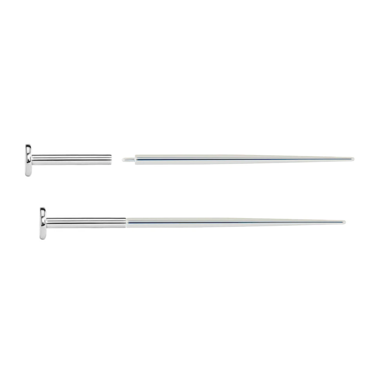 Pin taper de acero inoxidable grado implante para instalar joyería de 16g con rosca interna o sin rosca. Longitud de 1” y diseño cónico para facilitar el uso en una sola acción.