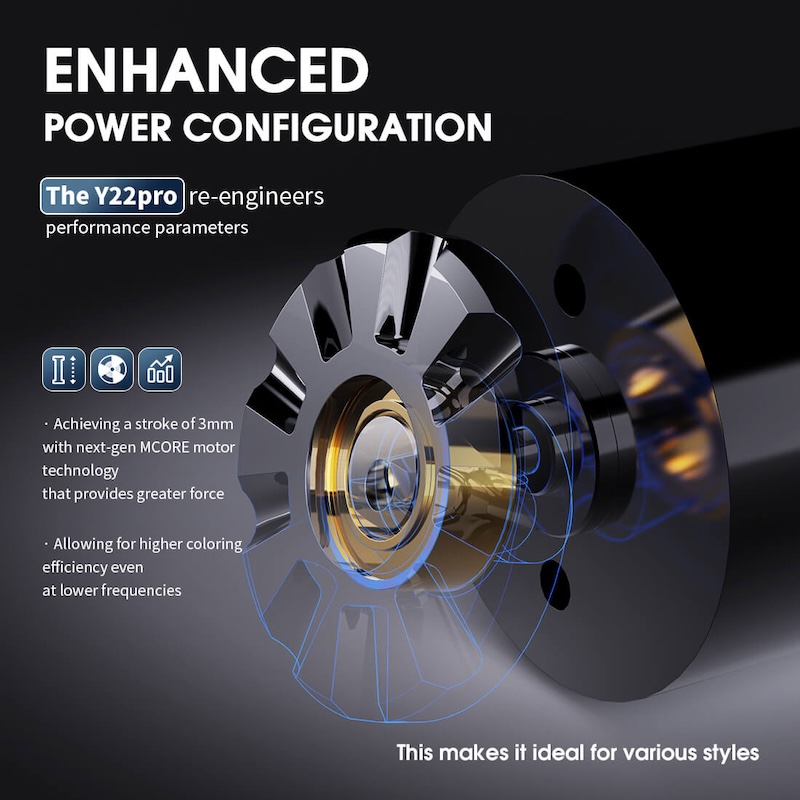 Su motor MCORE coreless proporciona un rendimiento estable con 10,000 rpm a 12V, generando una penetración consistente del pigmento incluso trabajando a frecuencias bajas. El stroke de 3.0 mm permite lograr una saturación suave del pigmento, adecuada para técnicas de PMU como cejas, delineado y labios, así como para distintos estilos de sombreado.