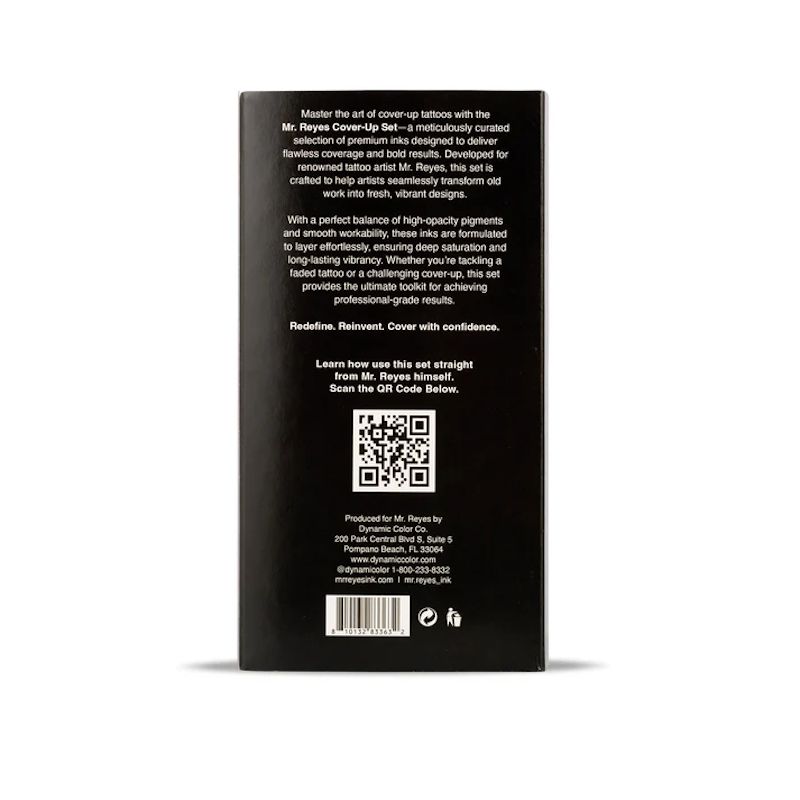 El Mr. Reyes Cover-Up Ink Set es un set profesional desarrollado para ofrecer máxima cobertura, saturación uniforme y un desempeño confiable en trabajos que requieren ocultar pigmento previo. Creado en colaboración con el reconocido artista Mr. Reyes, este set reúne tintas de alta opacidad formuladas para lograr resultados limpios, sólidos y consistentes.