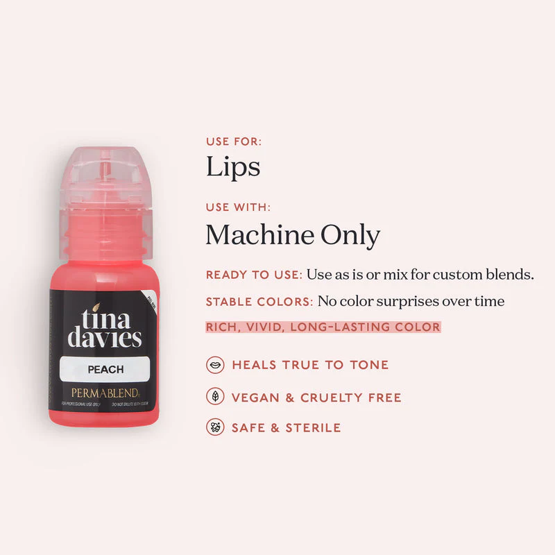 Peach – Tina Davies Lust Lip es un pigmento PMU de tono durazno cálido, formulado para aportar una calidez suave y natural en procedimientos de micropigmentación labial. Su color sutil permite realzar el tono natural de los labios, logrando un acabado equilibrado y delicado.
