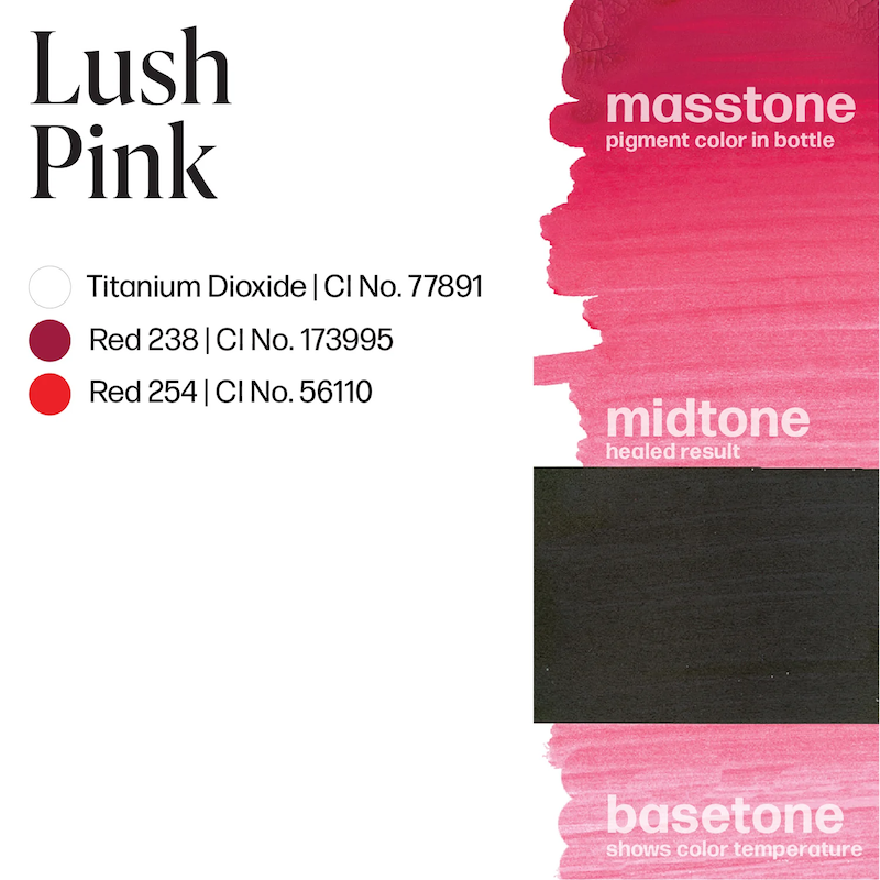 Lush Pink es un pigmento labial artesanal en un rosa altamente pigmentado con base roja y nivel de opacidad alto.