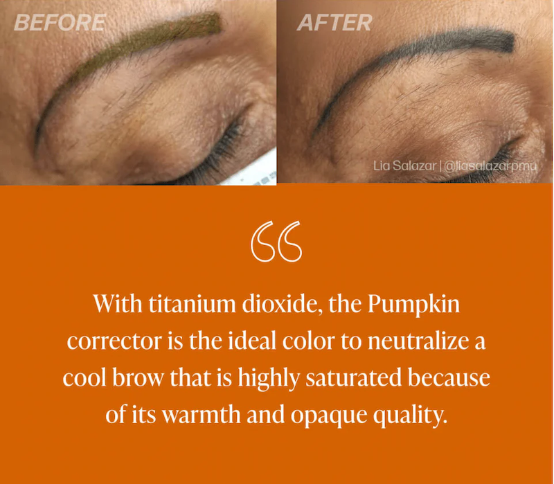 Pumpkin Corrector es un pigmento naranja, como su nombre lo indica, formulado para brindar cobertura duradera y corrección máxima. Está idealmente diseñado para cejas con tonos púrpura o azul y para lograr una cobertura opaca.