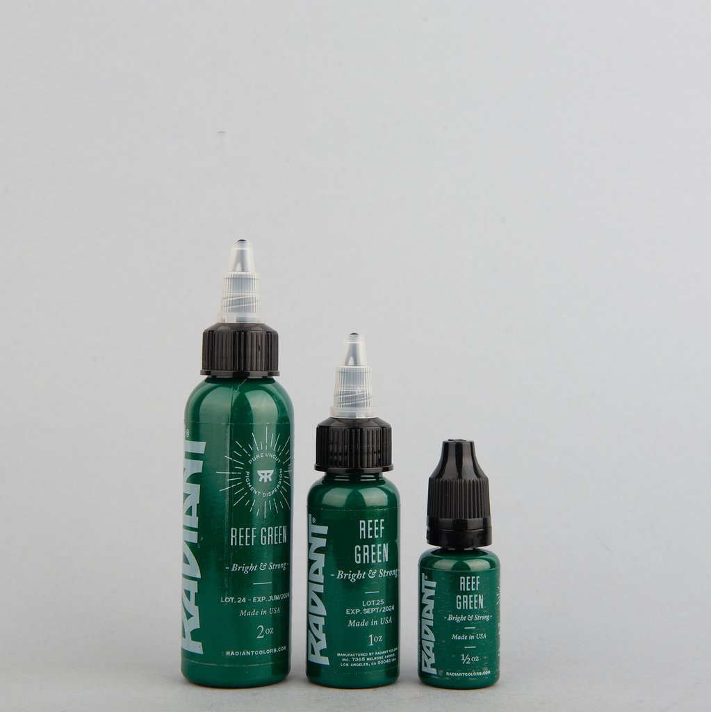 La tinta Radiant Reef Green evoca la belleza y profundidad de los arrecifes marinos, ofreciendo un verde intenso y sofisticado. Ideal para tatuajes que buscan un tono natural pero con presencia y elegancia.